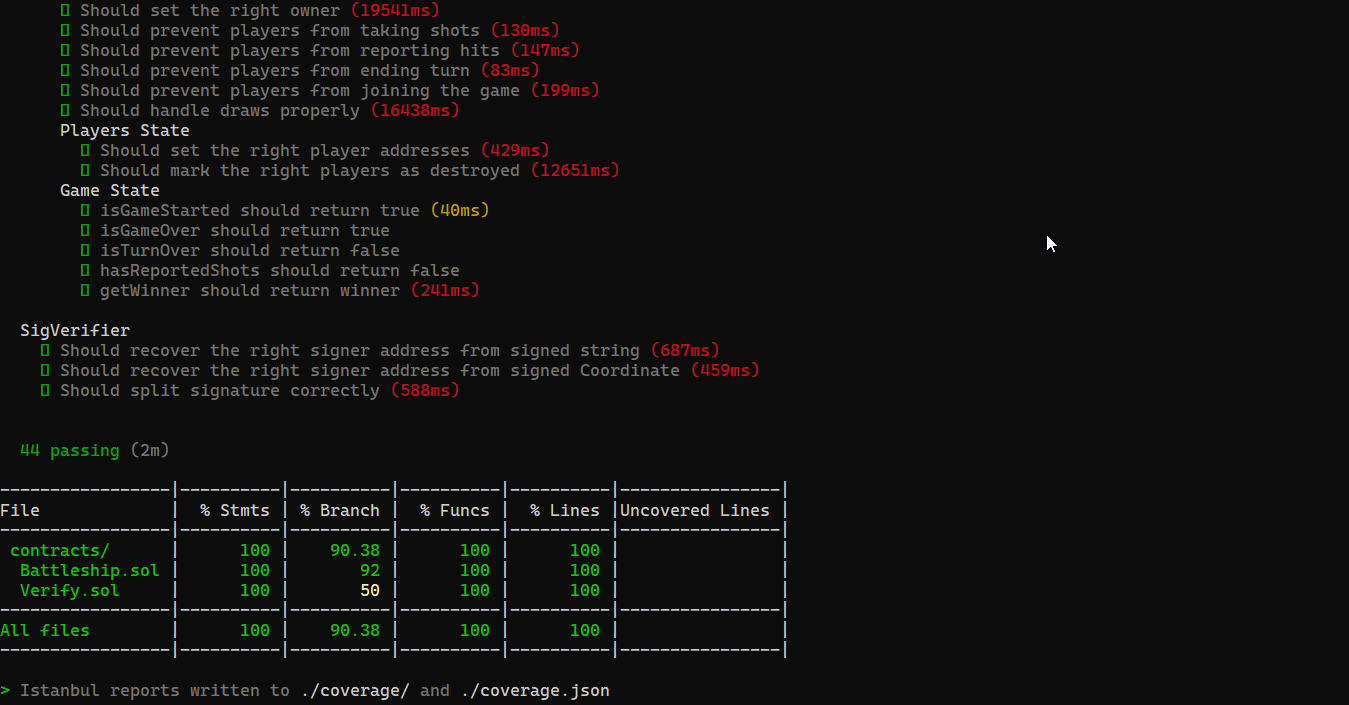 • playerHasReportedHits — a mapping of each player’s address to a boolean indicating whether that player has reported all the hits from their opponent’s shots during the current turn.